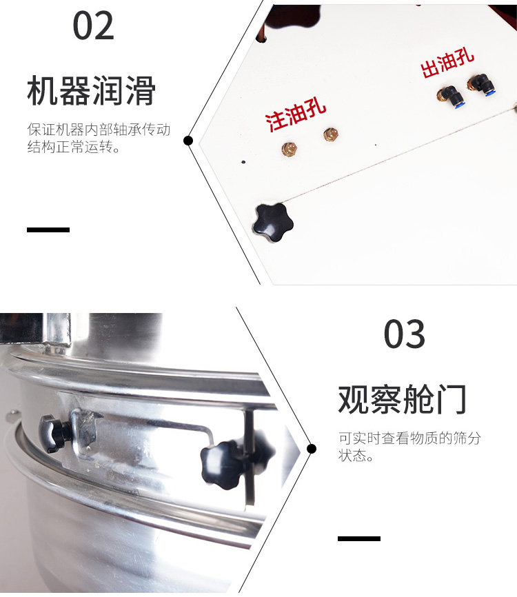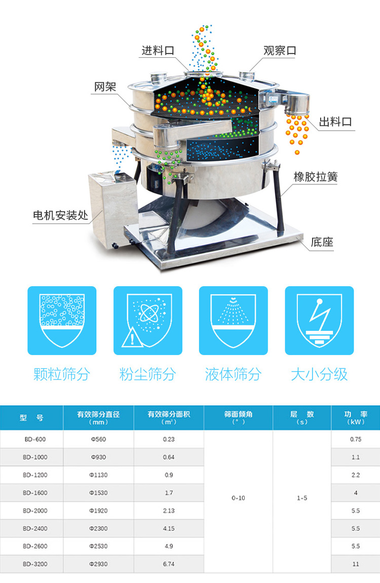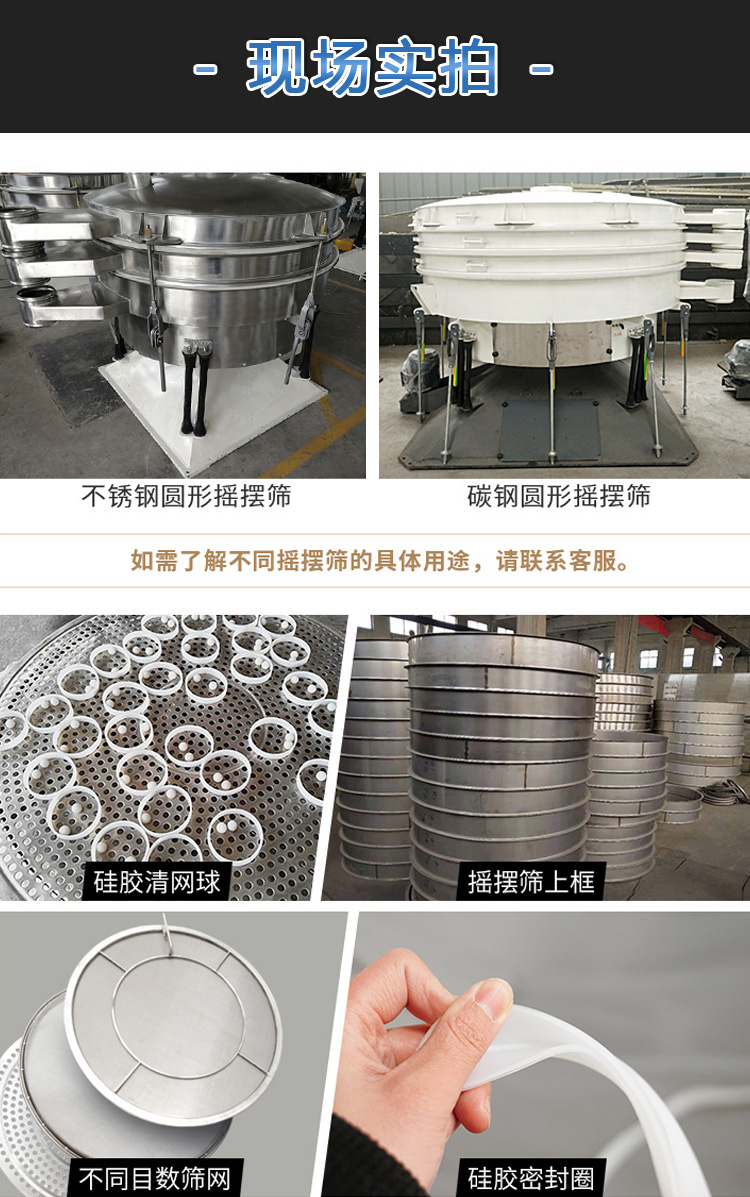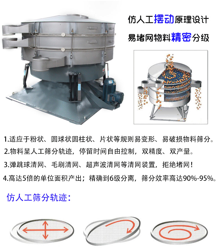 304不銹鋼圓形搖擺篩的仿人工設計極大程度上滿足了物料的高產、高效、高精度篩分需求,它是對原始篩分的機械模擬,相比普通旋振篩它有著高達幾倍的產量,篩分效率更是能達到90%以上,密閉除塵,操作安全。