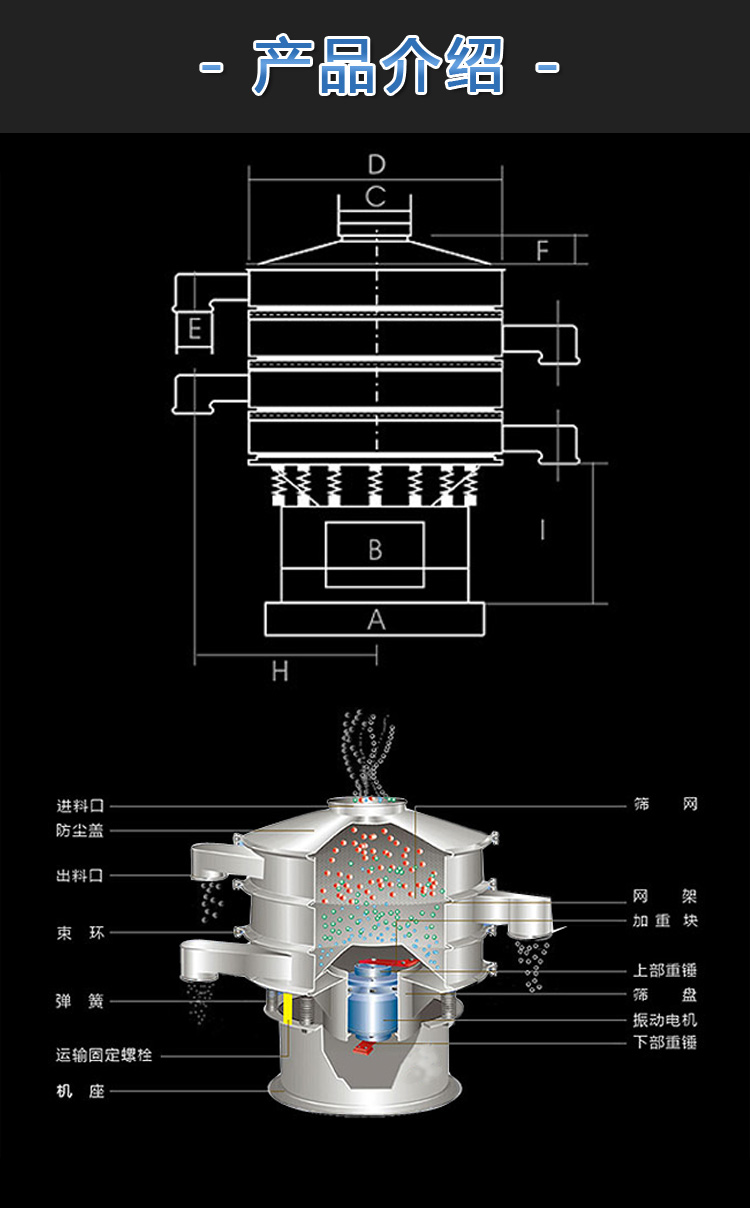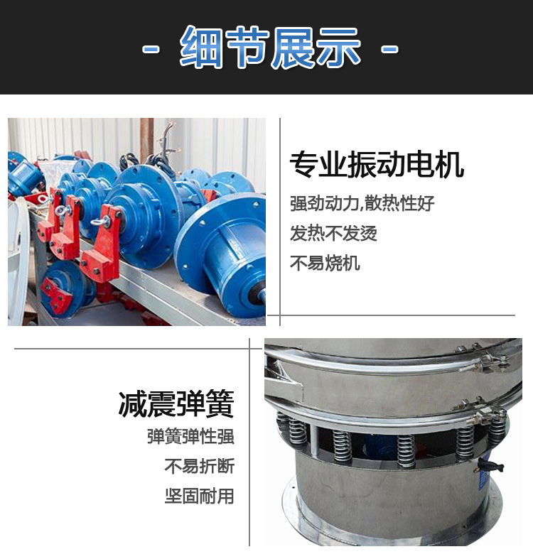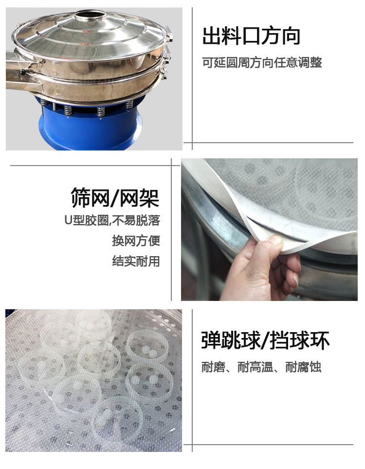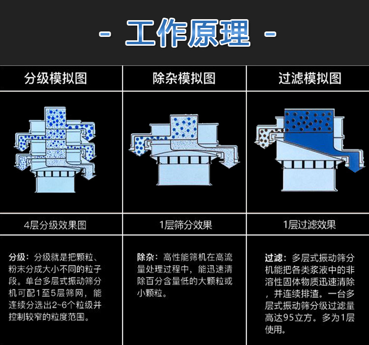 液體涂料振動(dòng)篩啟動(dòng)后,其動(dòng)力裝置,即振動(dòng)電機(jī)上端和下端具有不同相位的偏心塊,由于高速放置而產(chǎn)生復(fù)合慣性力。慣性力迫使篩機(jī)的振動(dòng)體作復(fù)合旋轉(zhuǎn)運(yùn)動(dòng),篩架在振動(dòng)力的作用下作連續(xù)往復(fù)運(yùn)動(dòng),驅(qū)動(dòng)篩面周期性振動(dòng),使篩面上的物料與篩箱作定向跳躍式運(yùn)動(dòng),在此期間,小于篩網(wǎng)表面孔徑的材料通過(guò)篩孔下降到下層,成為篩下物。大于篩面孔徑的物料在連續(xù)跳躍運(yùn)動(dòng)后從出料口排出,最終完成篩分工作。
