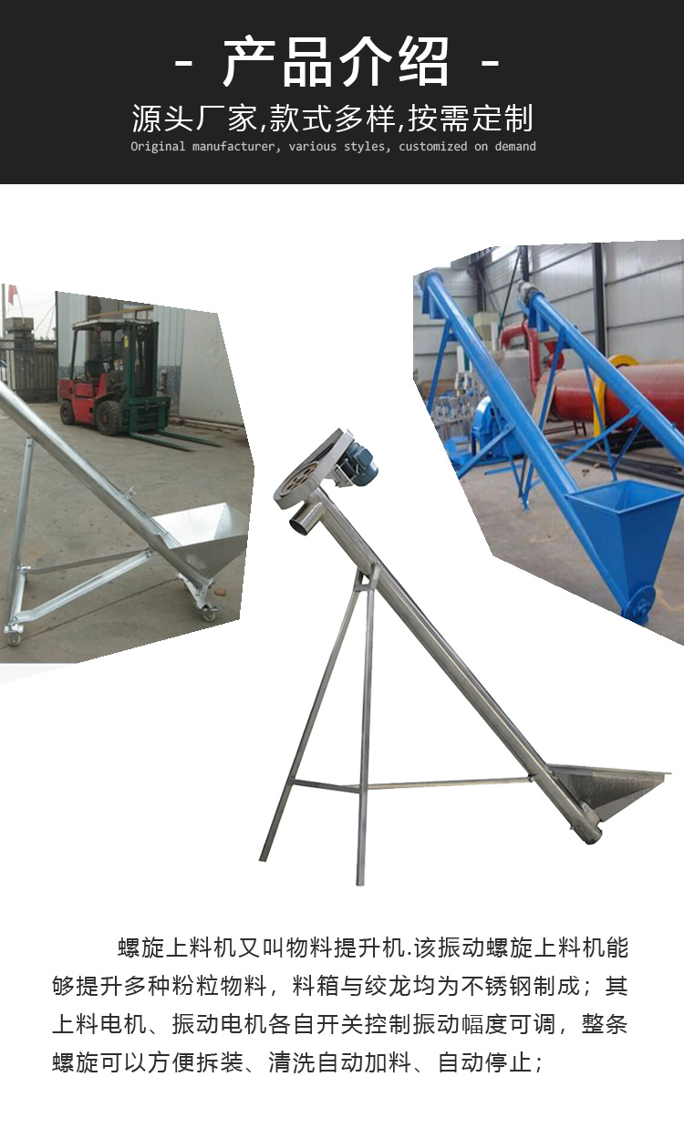 螺旋上料機一般常用于輸送顆粒狀粉末材料。適用于化工、食品、建材、包裝等行業對喂料要求較高的設備。它具有速度快、精度高、應用廣的特點。